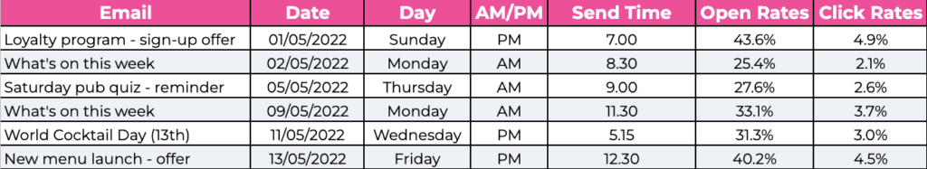 - Personalised content, such as the loyal or new menu offer will also increase click rates
